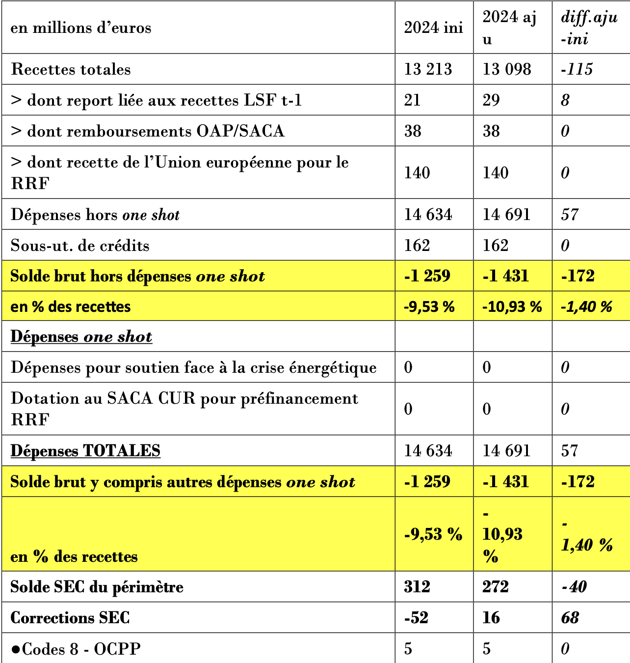 Dès lors, pourriez-vous nous indiquer les résultats chiffrés de cet ajustement à l’issue du conclave budgétaire et les éléments explicatifs des variations par rapport au budget de l’initial 2024 ? Des politiques nouvelles impactent-elles positivement ou négativement le déficit et le besoin de financement en comparaison à l’initial 2024 ? Si oui, pourriez-vous nous les lister en en précisant pour chacune le montant ? Quelle est désormais l’estimation de la dette à la fin de l’année 2024 ainsi que les ratios d’endettement et des charges de la dette ? Des actualisations des recettes ont-elles été prévues et dans l’affirmative, quelles sont ces actualisations par catégories de recettes ? Pourriez-vous également nous communiquer le solde budgétaire et le solde SEC? Quels sont les paramètres macro-économiques et démographiques qui ont été utilisés ?